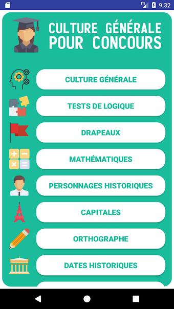 Culture générale pour concours adalah aplikasi edukasi yang dirancang untuk membantu pengguna mempersiapkan ujian dengan cara yang menyenangkan dan interaktif. Dengan lebih dari 3000 pertanyaan berkaitan dengan budaya umum dan sejarah, aplikasi ini juga menawarkan tes untuk meningkatkan kemampuan ejaan pengguna. Fitur tambahan seperti modul perhitungan mental dan tes logika dilengkapi dengan penjelasan yang mendetail, sehingga pengguna dapat memahami cara penyelesaian soal dengan lebih baik.